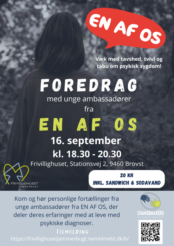 Kom til et stærkt og ærligt foredrag i Frivillighuset Jammerbugt med unge ambassadører fra En af os, som deler deres personlige erfaringer med at leve med psykisk sygdom. Formålet er at bryde tavshed, tvivl og tabu – og inspirere til mod, fællesskab og lyst til at søge hjælp i tide.
